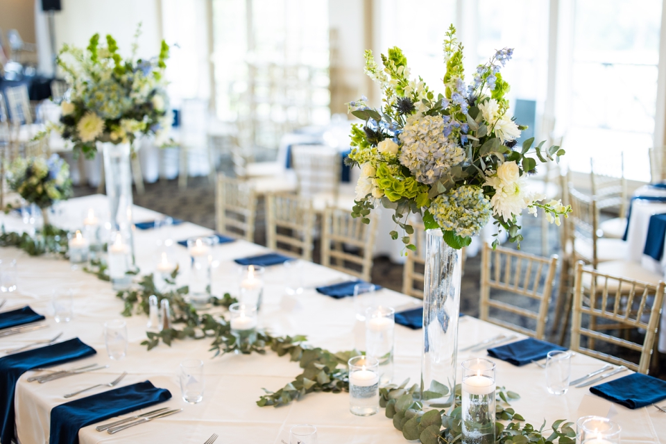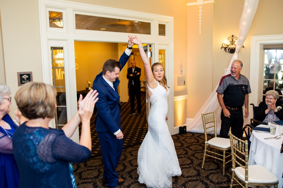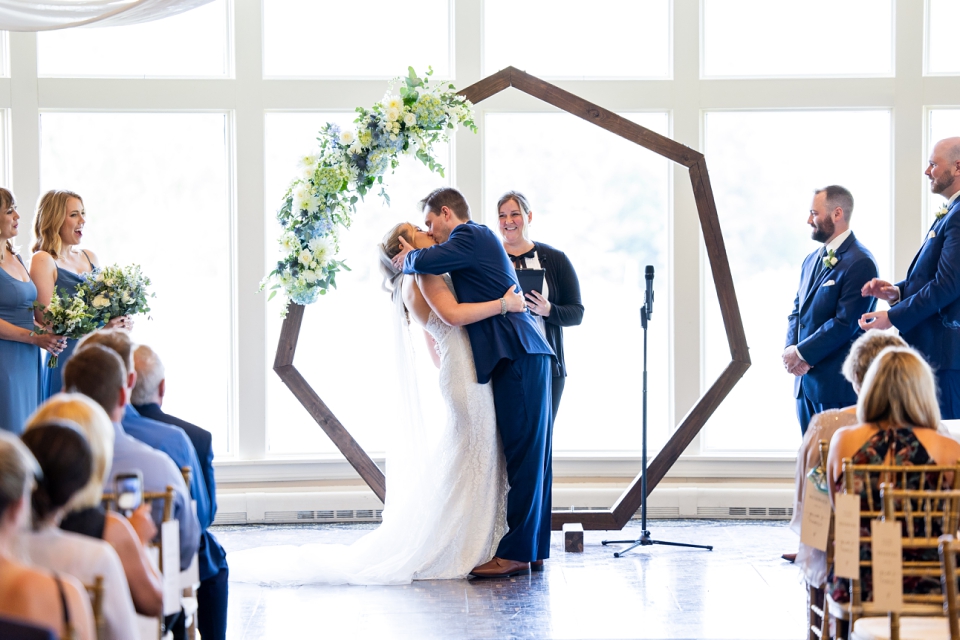 Lindsay & Kyle held their ceremony inside in the main ballroom and it was perfect! They had beautiful gold chairs from The Seatery, the drapery was from Ultimate Events, and an arch that was provided by Juniper Events Co. The gorgeous quartet music started playing and their ceremony was under way! They exchaged vows and rings, had readings, lit a unity candle, and were pronounced husband and wife!