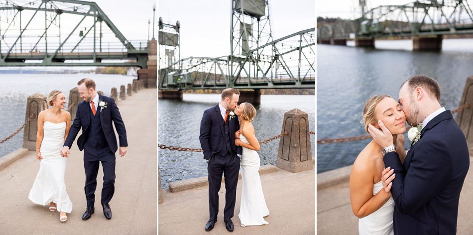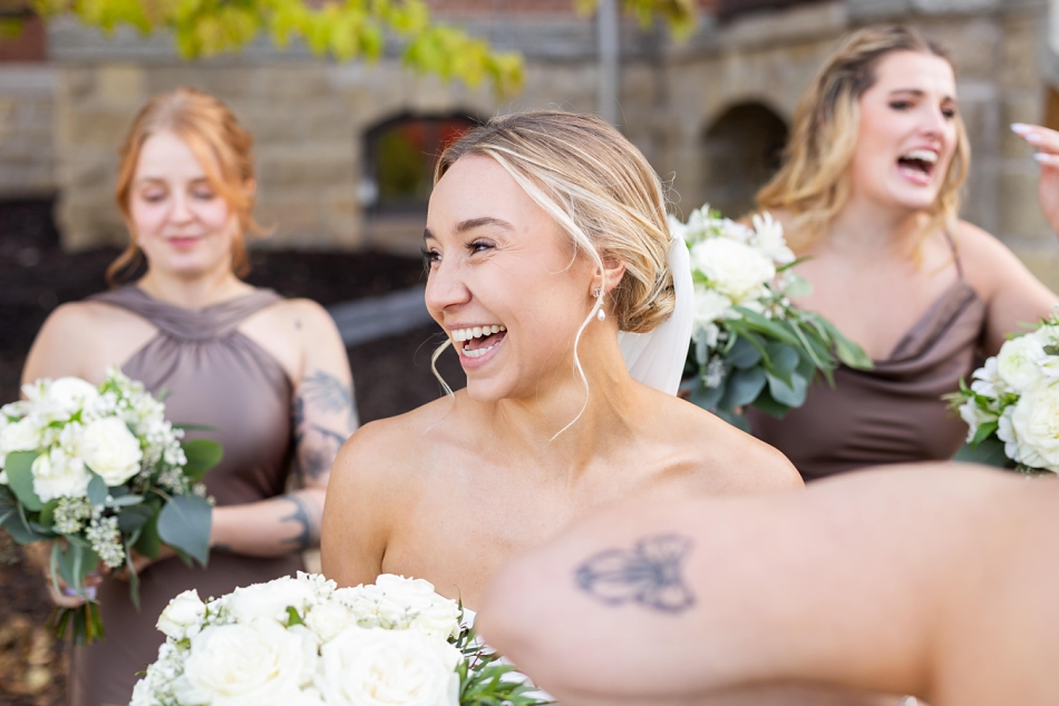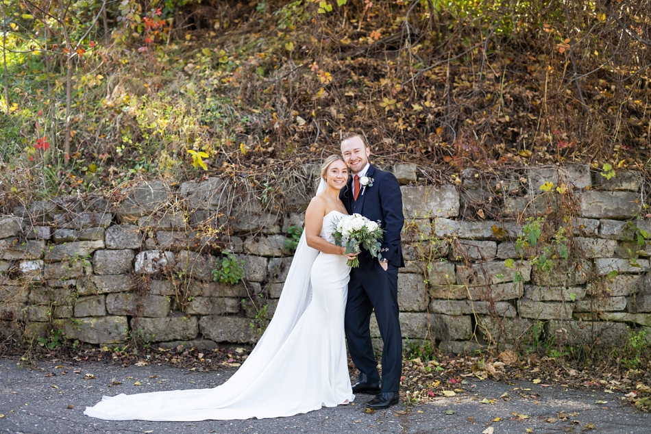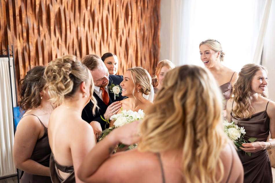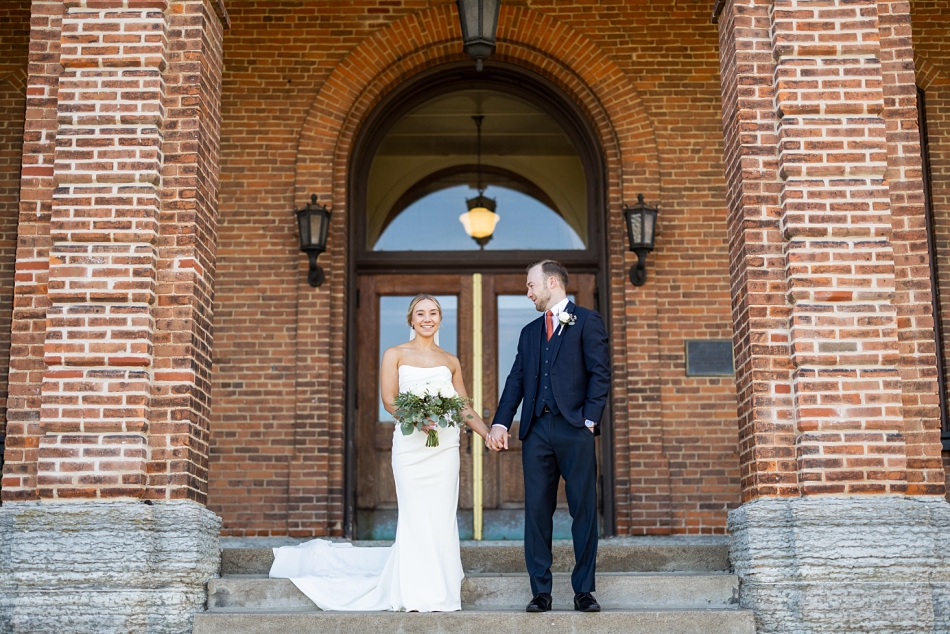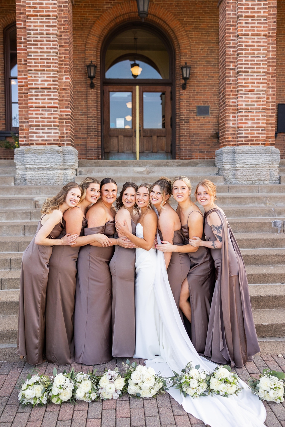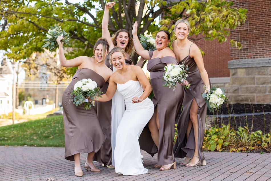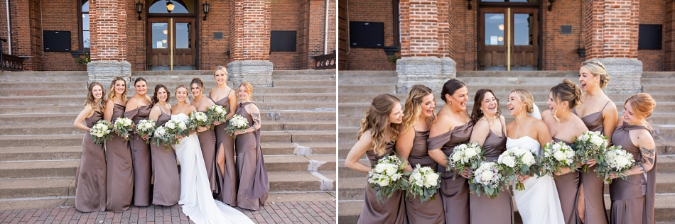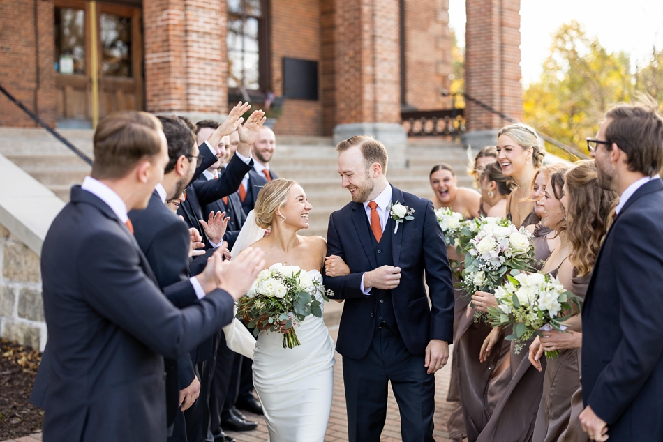 Surrounded by their super-fun wedding party, we headed out for photos—first to the venue and then to the majestic Stillwater courthouse, where classic stone architecture met modern elegance. What a fun backdrop to an energetic, lovely wedding party!