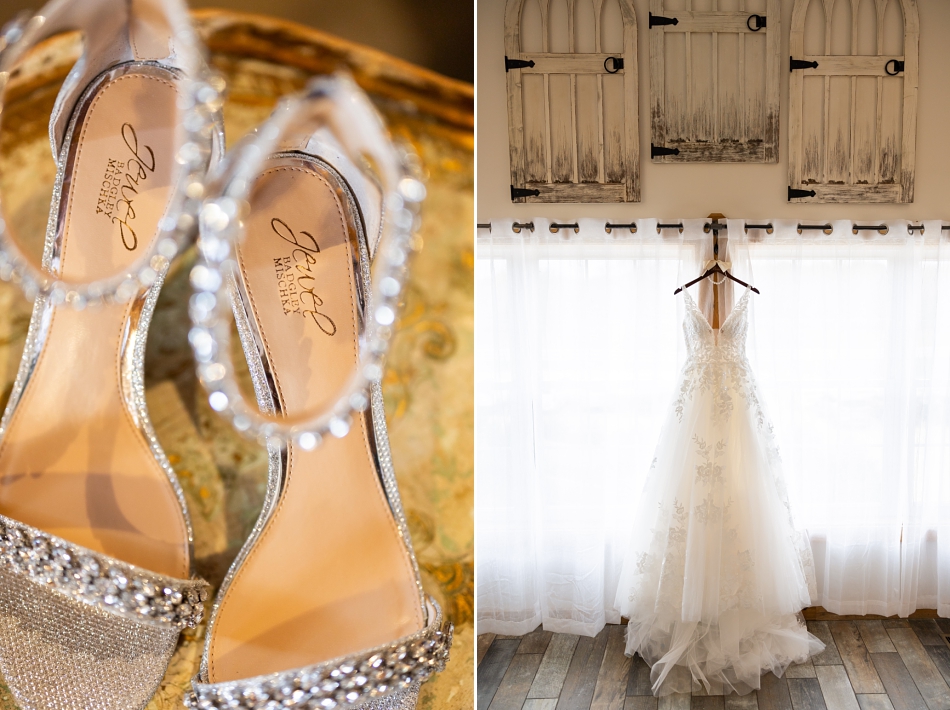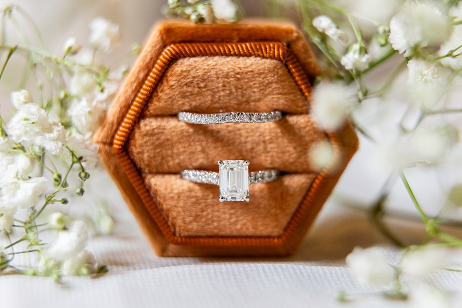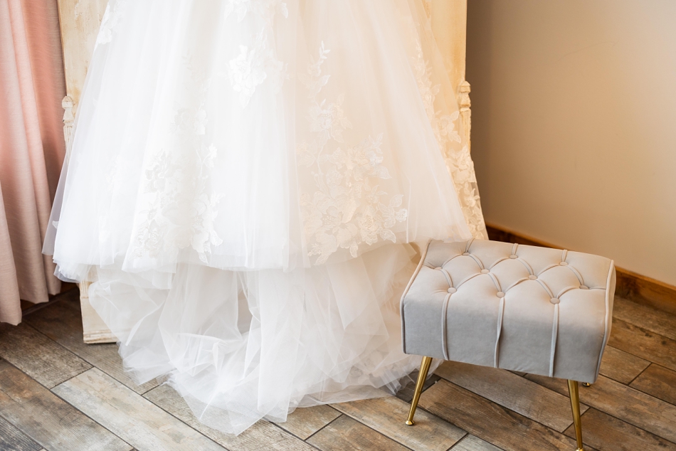 We started with the gorgeous details: soft textures, sparkling bridal accessories, and meaningful keepsakes from both Kaelyn and Ben. Her stunning Vow’d gown, perfected by Amazing Alterations, hung gracefully near the window while the thoughtfully chosen rings from Rare Carat glimmered alongside her bouquet from Studio B Floral. Their invitations from TheKnot tied it all together with simple, elegant charm.